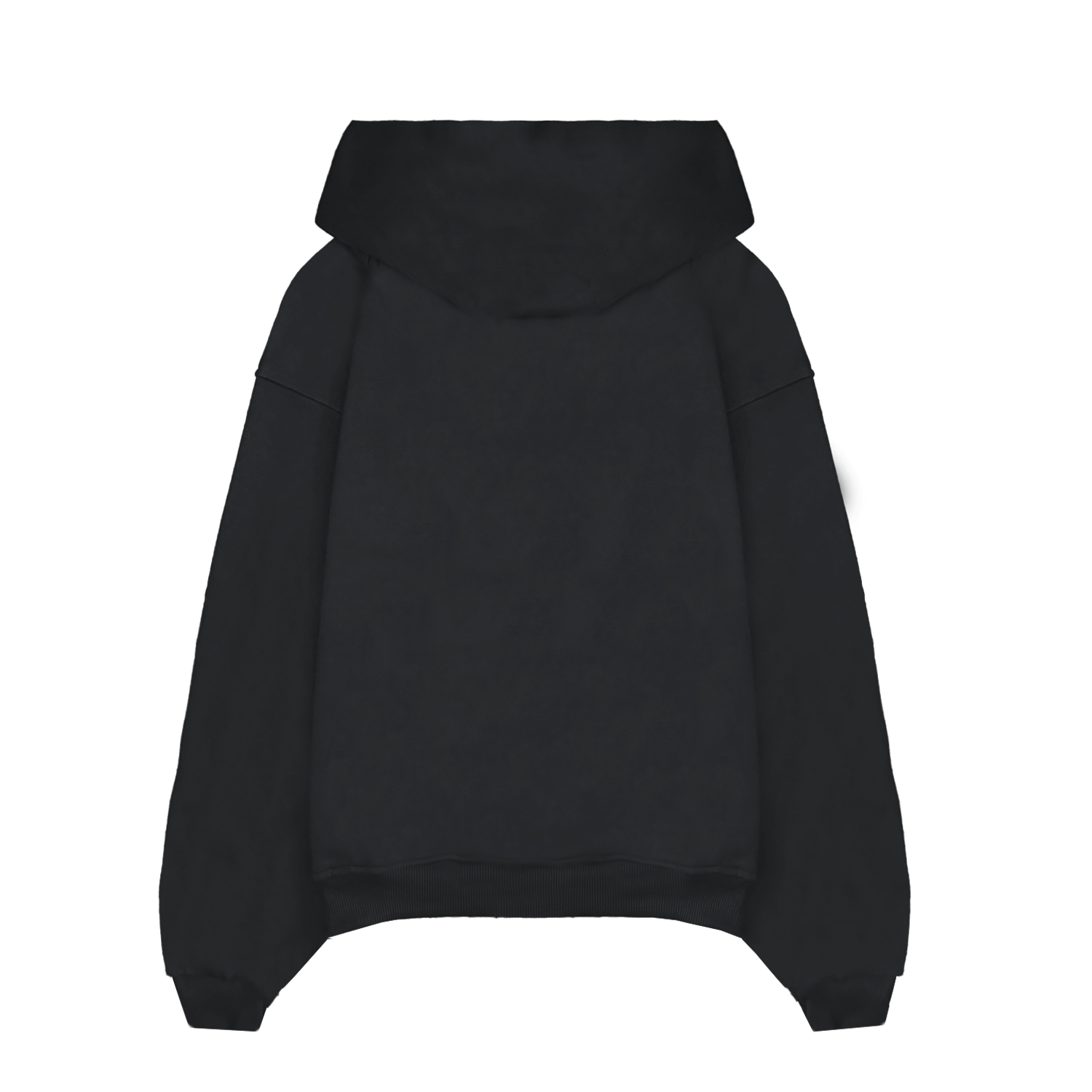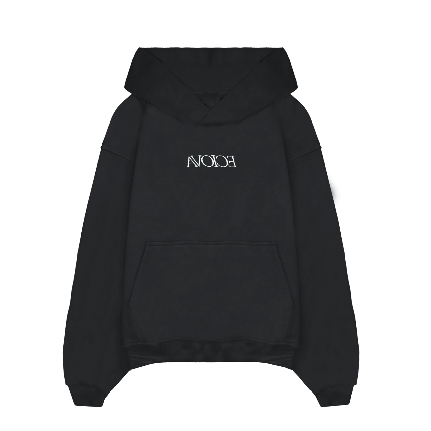 Black pullover hoodie made from a soft cotton blend for a comfortable and cozy feel. Features an embroidered AVOICE logo on the chest in white, a spacious kangaroo pocket, and ribbed cuffs and hem for a secure fit. Designed with a relaxed oversized silhouette for effortless layering and everyday wear.