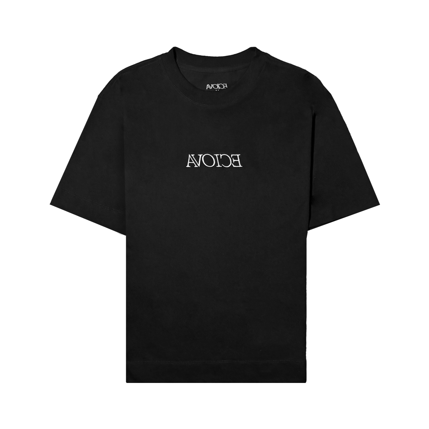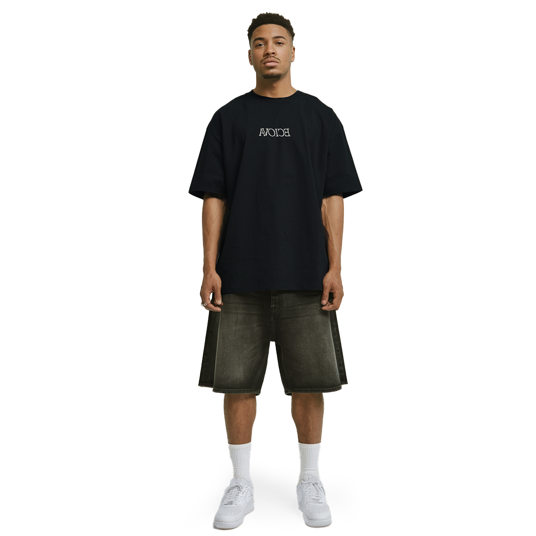 Black t-shirt made from 100% cotton for soft comfort and durability. Features a minimal AVOICE logo on the chest in white and a striking back print of a melting pocket watch held by a surreal hand, set against bold typography. Designed with a relaxed oversized fit for casual styling.